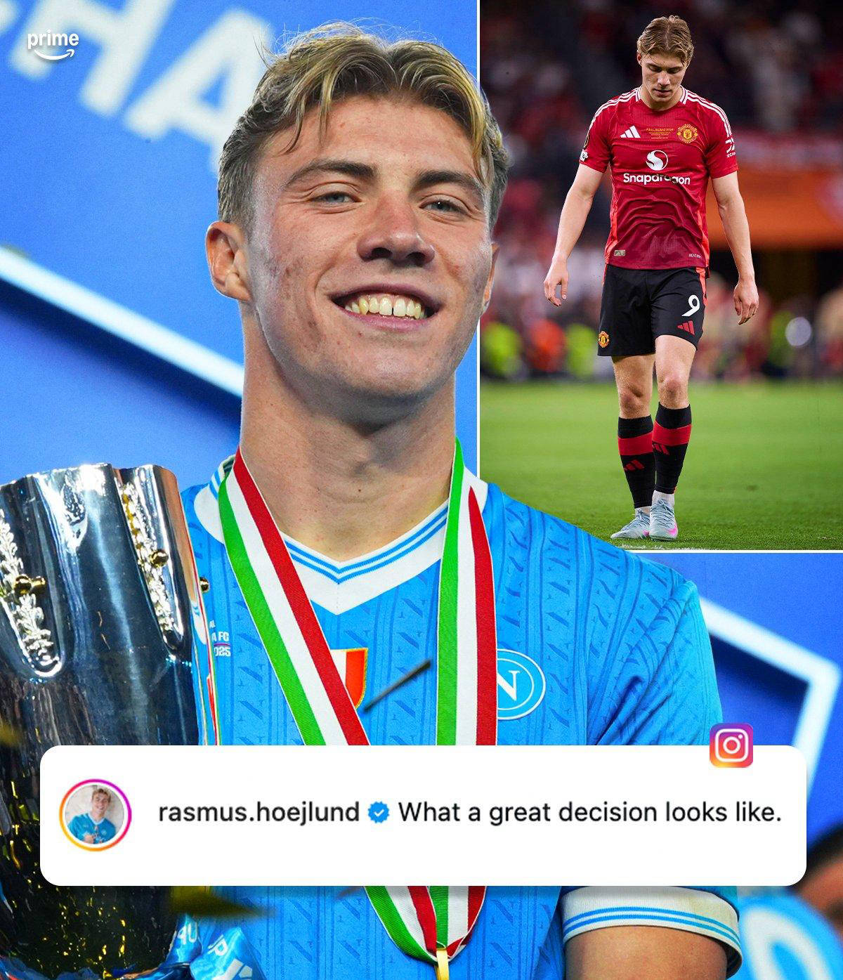 22岁的丹麦前锋拉斯穆斯·霍伊伦德在帮助那不勒斯夺得意大利超级杯后,通过社交媒体发布了一条意味深长的帖子,暗讽了他的老东家曼联,宣告双方关系彻底破裂。在他捧起冠军奖杯的照片下写道:“这就是一个伟大的决定。”显然,这个“伟大决定”就是果断离开当初梦想效力的曼联,转投意甲劲旅那不勒斯,实现自己职业生涯的新突破。